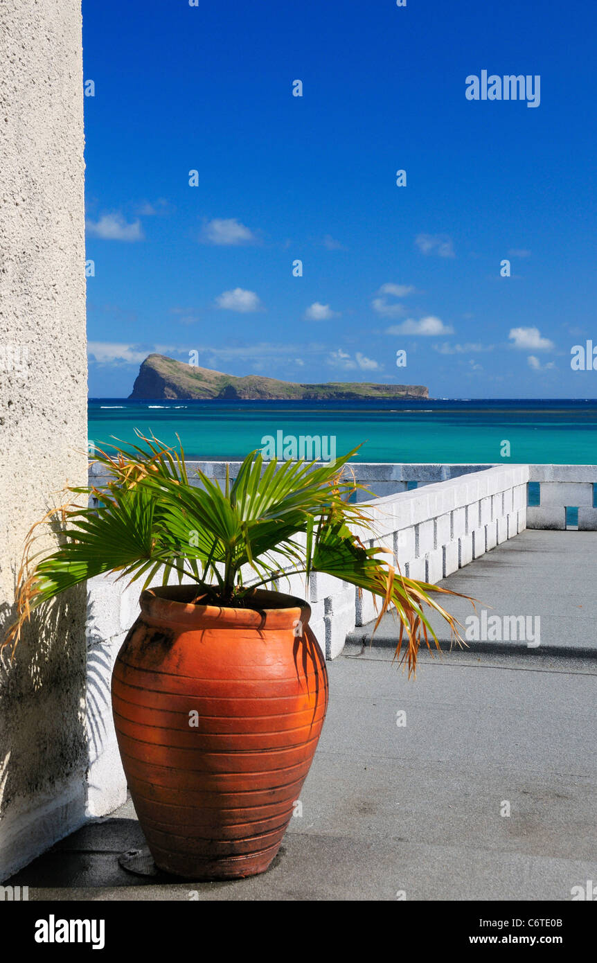 Vue vers l'île de Coin de Mire de l'hôtel balcon à Cap Malheureux, Rivière du Rempart, Ile