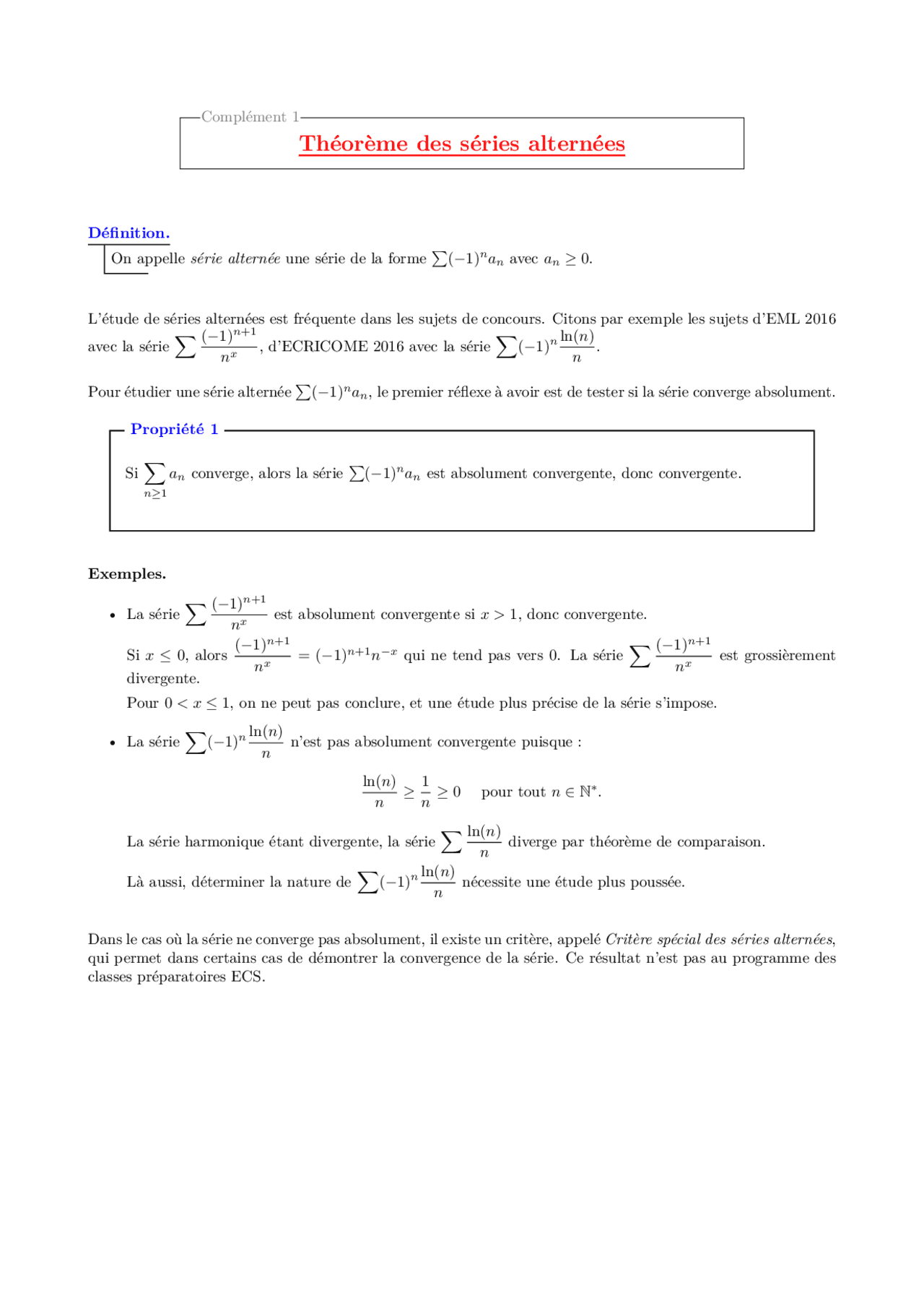 Les séries alternées Cours et exercices corrigés Progresserenmaths