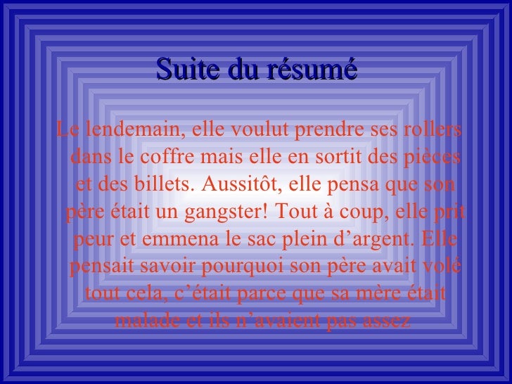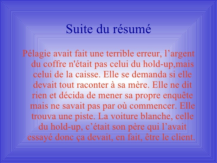 4. 5. Suite du résumé d'argent pour la soigner. Pélagie se dit: « mon père est un gangster! mais il nous l'a bien caché! il pourrait même être un gangster professionnel! ». Elle appela alors la police en racontant qu'elle avait vu deux voleurs se disputer et qu'ils ne voulaient. 6.