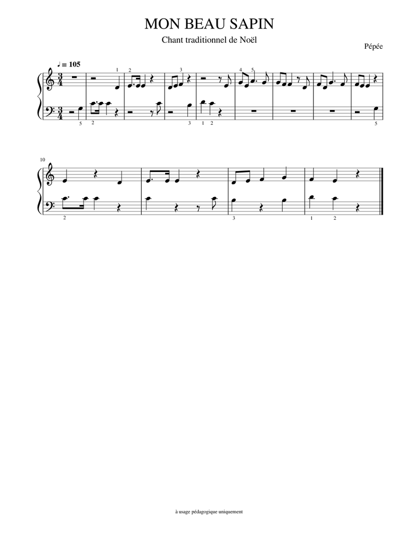 Partition mon beau sapin. Afin de préparer la fête de Noël en musique Mélopie vous propose cette partition de la chanson « Mon beau sapin ». Elle est à télécharger ici : partie 1 partie 2 . Votre enfant n'a pas les connaissances de piano pour pouvoir jouer cette partition simplisme ?