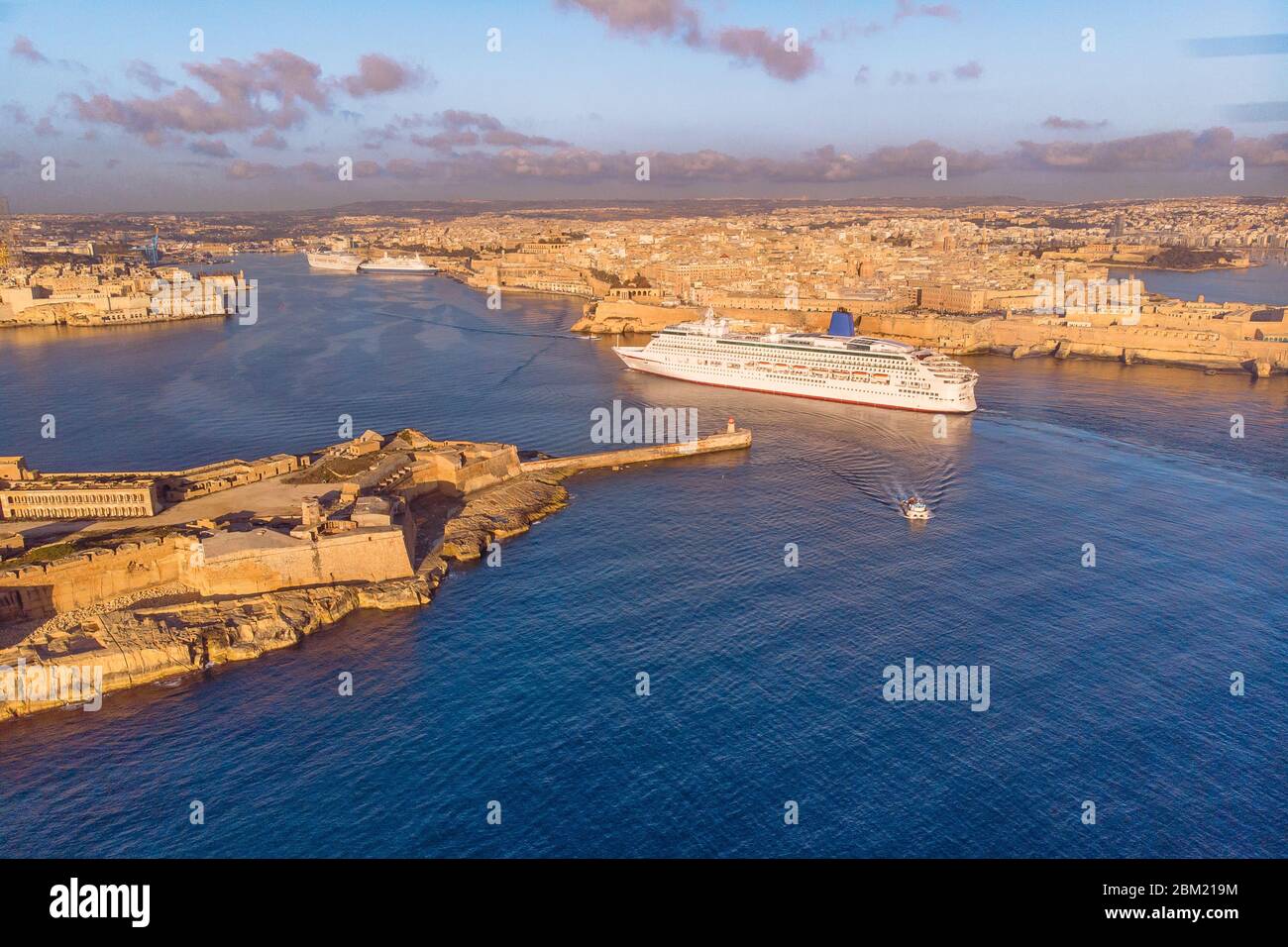 Bateau de croisière port de la Valette, Malte lever du soleil. Photo vue aérienne Photo Stock