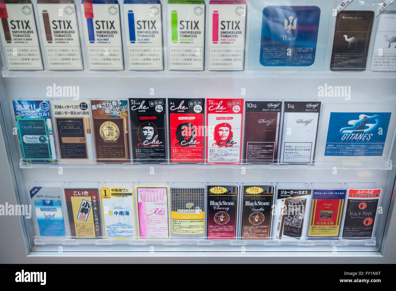 Las etiquetas de los paquetes de cigarrillos en el quiosco de la ciudad de Tokio, Japón