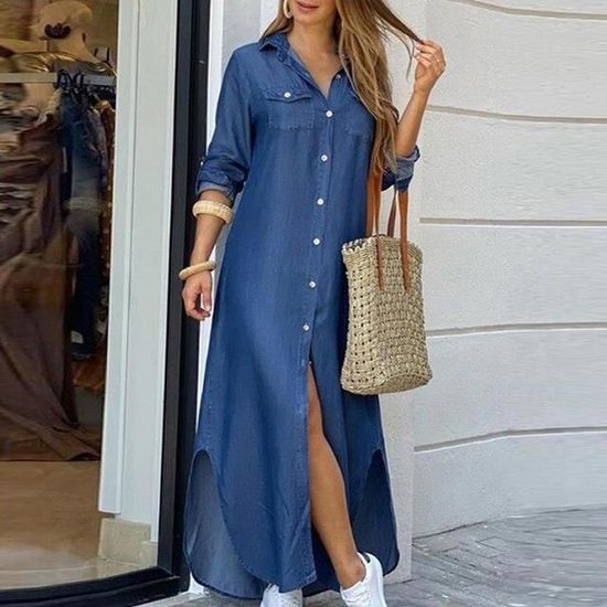 Robe,Robe longue pour femmes,col à revers,boutons,imprimé de lettres,décontractée,manches