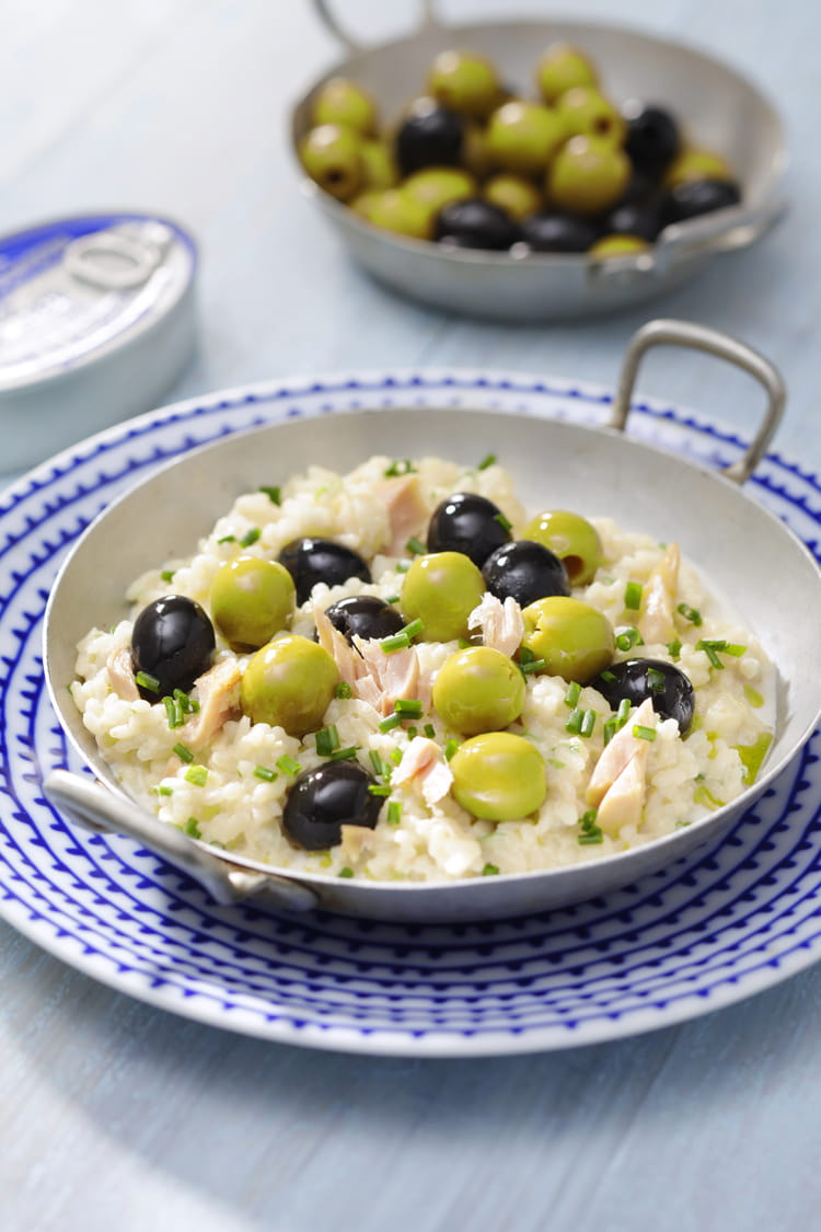 Recette de Riz Bomba, bouillon aux olives vertes et noires et crème au thon