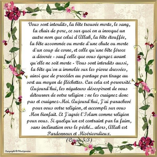 [356] Voir note verset 3, sourate 5. sourate 5 verset 90 English. O you who have believed, indeed, intoxicants, gambling, [sacrificing on] stone alters [to other than Allah], and divining arrows are but defilement from the work of Satan, so avoid it that you may be successful. page 122 du Coran en français.